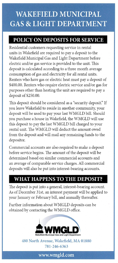 Residential: Residential renters are required to pay a deposit to ensure start of service. The deposit will be required at the time of application. This deposit will be deducted from the last WMGLD bill.